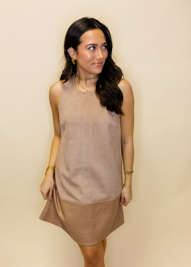 Slip into effortless elegance with this camel suede shift dress that's ready for anything. The contrast faux leather hem adds an unexpected edge, w...