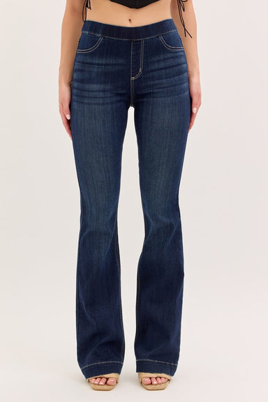 Slip into the perfect mix of comfort and style with our Hi Rise Dark Flare Jeggings. These stretchy, pull-on jeggings hug your curves while giving ...