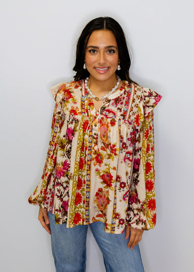 Embrace your free-spirited side in this charming peasant top bursting with vibrant floral patterns. The relaxed silhouette and delicate details cre...