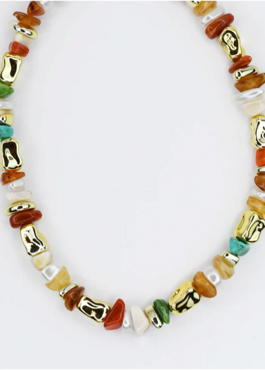 Add a splash of sparkle to your fall wardrobe with the Happy Mess Gemstone Necklace. This playful statement piece effortlessly brightens any outfit...