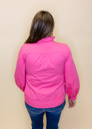 This playful pink button-up top features charming ruffle details along the front, adding a feminine twist to a classic long-sleeve silhouette. Tail...