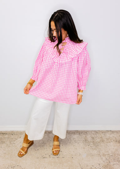 Adorable pink gingham cotton poplin top featuring a charming ruffle yoke detail and front tie closure. This playful piece brings vintage-inspired f...