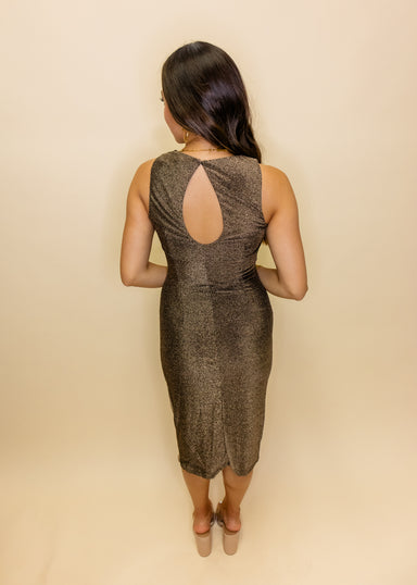 Get ready to sparkle and shine in our Bronze Shimmer Midi Dress! This ruched glitter dress is perfect for making a statement at any event. With a f...