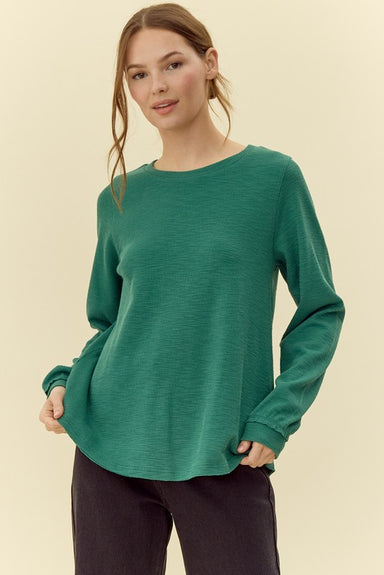 Take your style to new heights with this green ribbed long sleeve top. The U-neck and shirring detail on the back add a touch of playful flair. The...