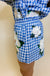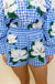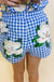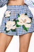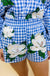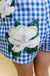 Get ready to turn heads with our Blue & White Gingham Scattered Magnolia Short! With feminine and fabulous features like detailed magnolias in sequins, bead work, and velvet, and a smocked waist for a flattering fit, you'll feel confident and chic all day long. This short is a must-have for any fashionista!