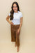Slip into cozy style with these Camel Suede Scallop Pocket Pants. Their crop length and wide leg design offer breezy comfort whether you're out for a casual day or dancing the night away. The playful scalloped pockets add a fun twist, making these pants a standout choice for any occasion.