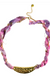 Make a splash with the Lavender Scarlet Twist Necklace, featuring a bold hammered gold pendant that catches every eye. Wrapped in a silky scarf, this statement piece adds a playful twist to your outfit, perfect for turning heads with effortless style.