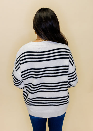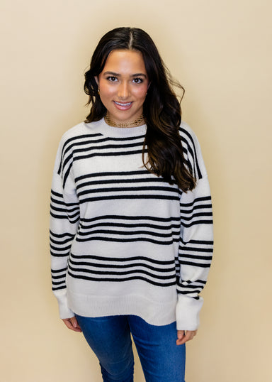 Stripes never go out of style—especially when they're wrapped around you in the coziest long sleeve sweater ever. This classic black striped beauty...