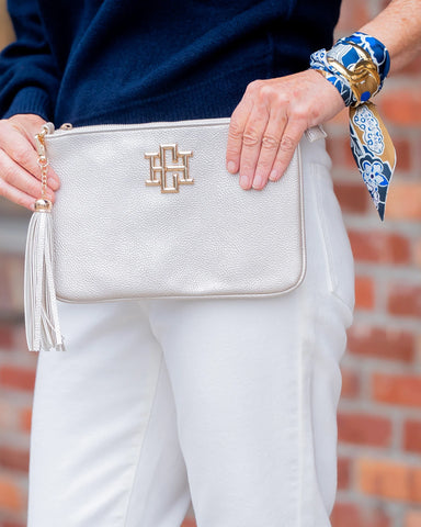 The Madelyn Clutch/Crossbody in Pebbled Pearl combines sleek envelope style with practical design, featuring a secure zipper and a removable tassel...