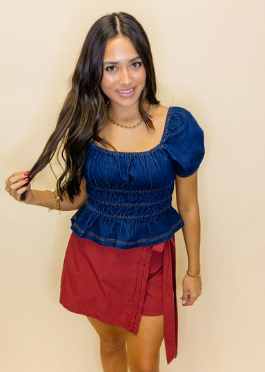 This playful denim crop top brings charm to your wardrobe with its square neckline and cute short puff sleeves. The smocked bodice hugs you just ri...