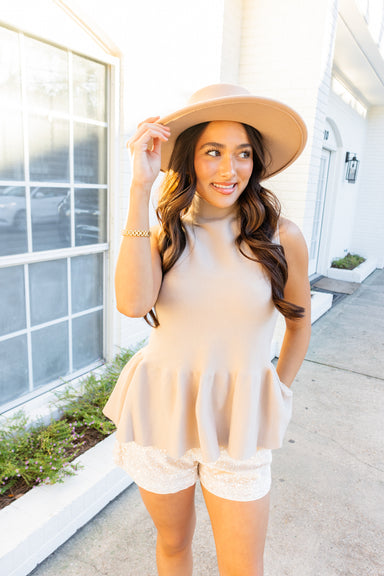 Elevate your layering game with this adorable latte peplum sweater tank! The mock neck keeps things cozy while the playful peplum hem adds a flirty...