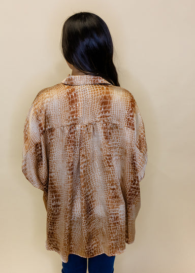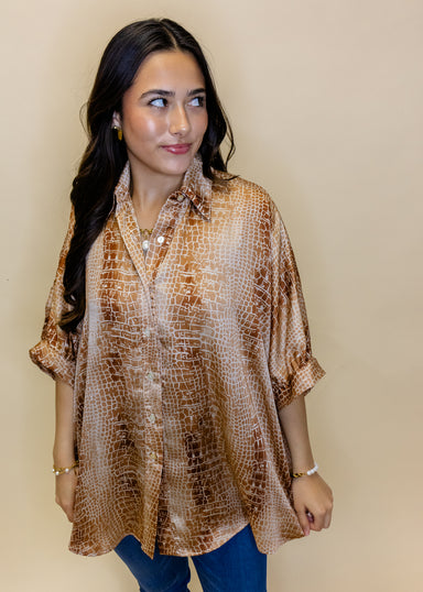 Elevate your fall wardrobe with this stunning Arizona Opulent Crocodile Button Down Top! Crafted from luxurious satin-like fabric, this gorgeous pi...