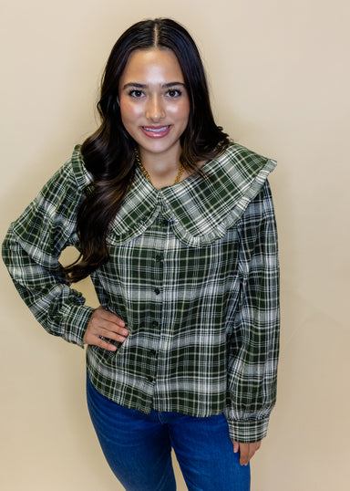 Step into timeless charm with this Hunter Green Gingham Peter Pan Collar Top! The classic gingham pattern pairs perfectly with a whimsical oversize...