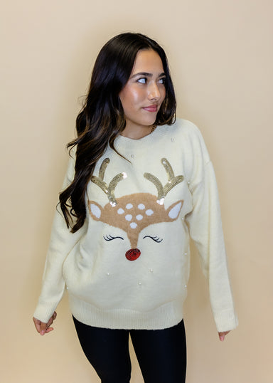 Cozy up in holiday charm with this adorable ivory reindeer sweater! Featuring a relaxed drop shoulder silhouette, this playful top showcases a cute...