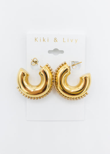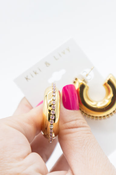 Get ready to add some bling to your ear game with these Pink Rhinestone Line Thick Hoops! These gold hoops feature a playful line of pink and clear...