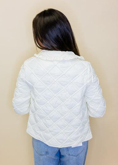 Embrace cozy charm with this Ivory Ruffle Detail Quilted Jacket. Its oversized, ruffled collar adds a flirty twist, while the soft quilted fabric k...
