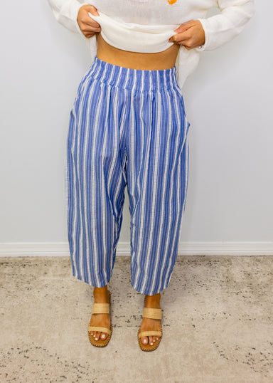Effortlessly chic and oh-so-comfy, these blue striped pants are your new go-to for laid-back style. The relaxed fit skims your silhouette without c...