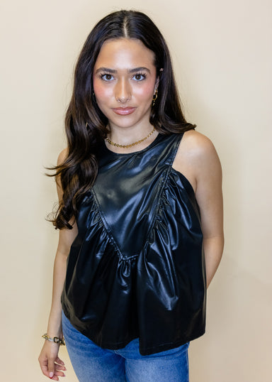 Rock an edgy-chic vibe with this Black Leather Ruched Top—where bold meets beautiful. Crafted from faux leather with a structured yoke and softly g...