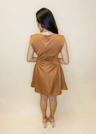 Caramel Side Ruched Dress Elevate your wardrobe with this sleek sleeveless mini that effortlessly blends edge and elegance. Strategic side cut-outs...