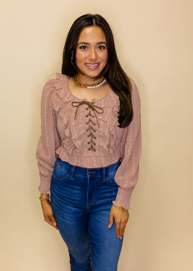 Flirty and feminine, this blush-hued top brings instant charm to your wardrobe. Delicate ruffles add romantic texture while the lace-up front ties ...