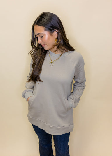Get cozy with a twist in this Taupe Fleece Asymmetrical Sweatshirt! Featuring a comfy crewneck and a modern asymmetric hemline, it’s perfect for th...