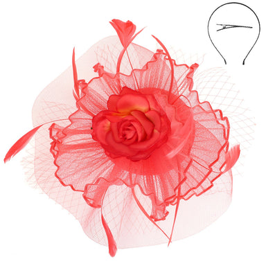 FEATHERED ROSE BLOOM MESH FASCINATOR WITH CLIP AND HEADBAND