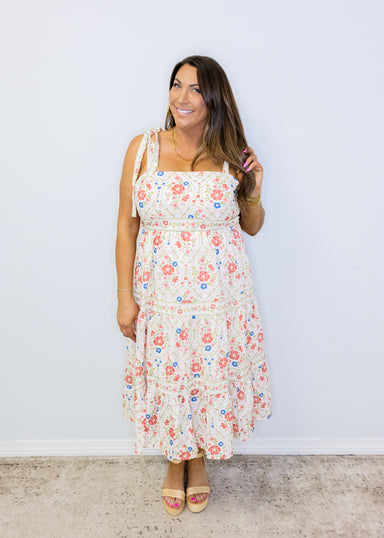 Twirl into spring with this charming red multi-floral midi dress! The square neckline and delicate shoulder ties create an effortlessly chic silhou...