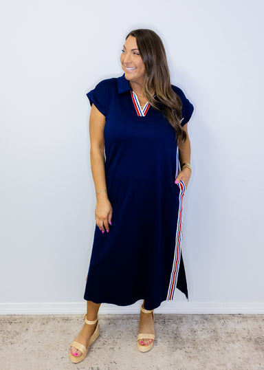 Slip into effortless style with this navy midi dress that's as fun as it is functional. The flattering v-neck and cap sleeves keep things breezy, w...