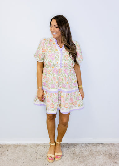 Twirl into spring in this charming lavender floral tiered dress! Featuring delicate contrast detailing and a flattering top button closure, this fe...