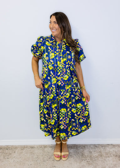 Turn heads in this vibrant blue floral tiered midi dress that effortlessly transitions from office to weekend adventures. The playful layered silho...