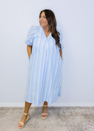 Drift into spring in this breezy blue striped maxi dress! The relaxed v-neckline and flowy short sleeves create an effortlessly dreamy silhouette t...