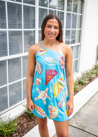 Slip into effortless vacation vibes with this charming mini dress! Featuring delicate shell trim detailing along the neckline and hem, it's the per...