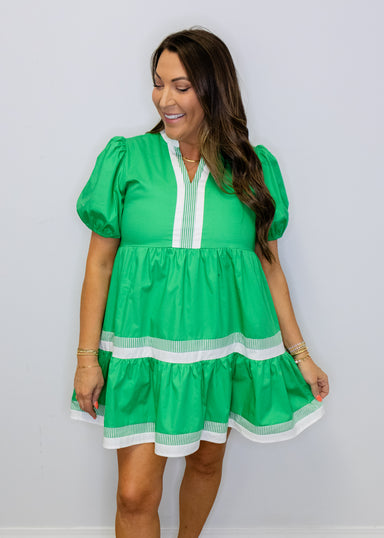 This gorgeous kelly green babydoll dress is the perfect spring and summer essential. Short puff sleeves frame the shoulders while a standing neckli...