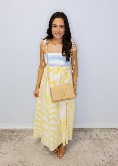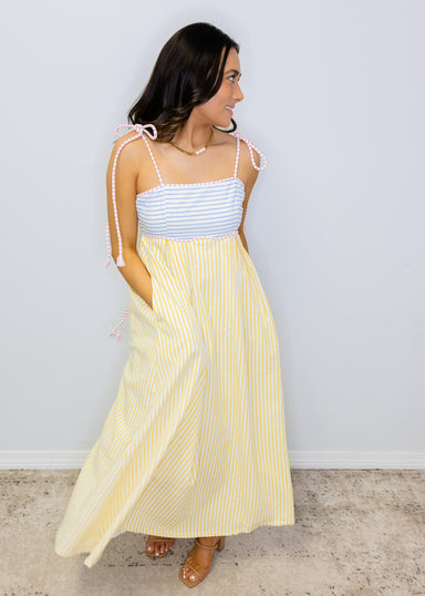 Effortlessly chic and playfully feminine, this pastel stripe tie-back midi dress combines timeless elegance with modern flair. The flowing silhouet...