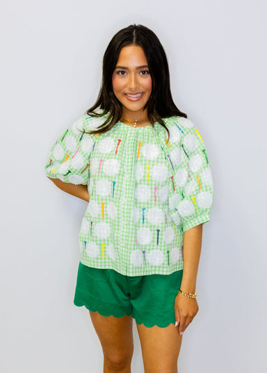 Elevate your golf course style with this charming green and white gingham button-up top, crafted from soft cotton for all-day comfort. Featuring pl...
