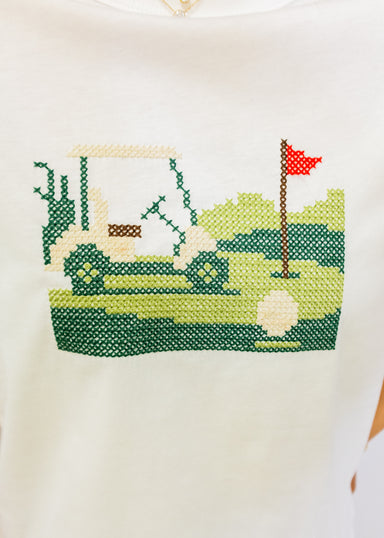 Classic white tee featuring a charming embroidered golf cart design. Perfect for golf enthusiasts and casual wear alike, this comfortable everyday ...