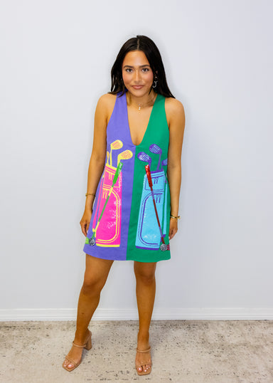 Swing into style with this eye-catching tank dress featuring a vibrant green and purple colorblock design paired with a playful multi-color golf cl...