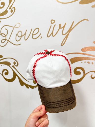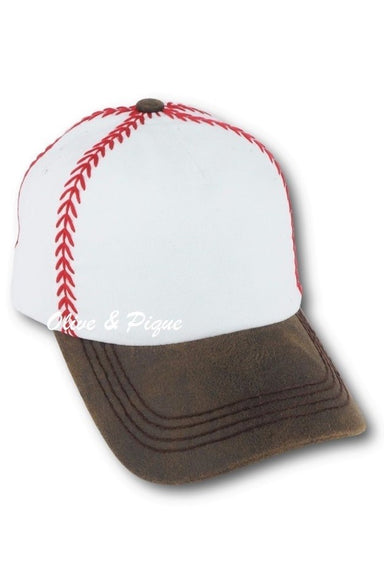 Score a home run in style with our Brown Baseball Stitching Detail Hat! This awesome themed cap features a catcher's mitt colored brim and red base...