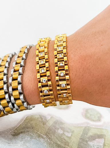 This two-toned watch band bracelet is stunning for days and nights alike. With its thick design and versatile style, it's the perfect accessory for...