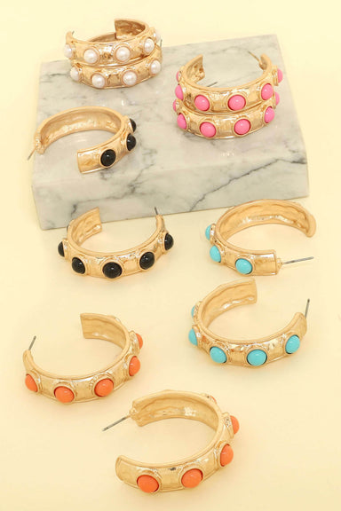 BEZEL-SET FAUX CABOCHON C-HOOP POST EARRINGS IN GOLD TONE METAL HEIGHT: 1.5" WIDTH: 0.4"