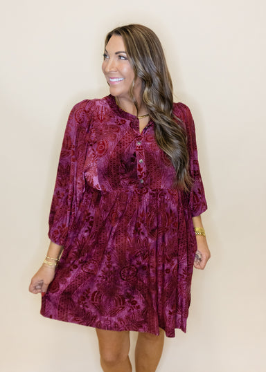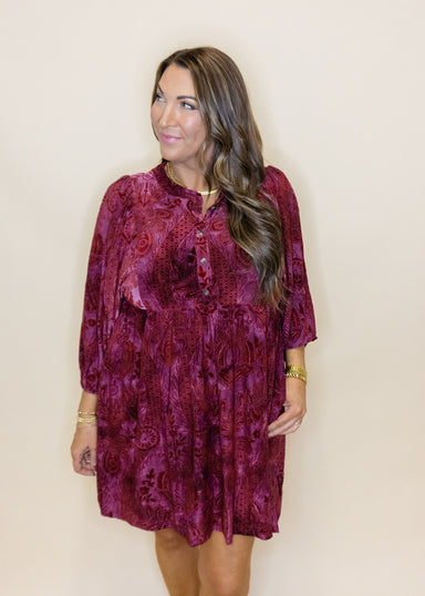 Slip into luxury with our Burgundy Velvet Jacquard Dress. Made with soft, flowy velvet and featuring a round neckline and convenient pockets, this ...