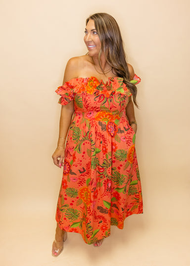 Elevate your wardrobe with this enchanting plus-size maxi dress that captures effortless elegance. The dreamy coral floral print peeks through a de...