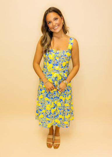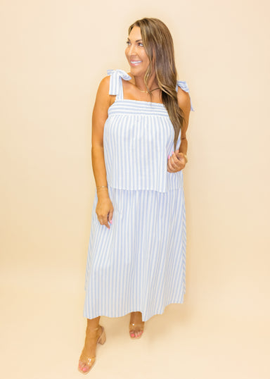 Effortlessly chic and undeniably fun, this blue striped midi dress is your new go-to piece. The lightweight cotton blend features subtle stripes an...