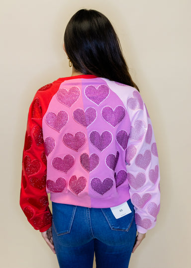 Sparkle and shine in this vibrant colorblock sweatshirt featuring dazzling rhinestone hearts that catch the light from every angle. The playful mix...