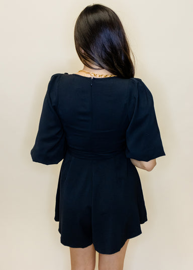Turn heads in this chic black bubble sleeve tie romper—the perfect pick for date night or cocktail hour. The flattering fit hugs you in all the rig...