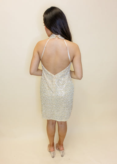 Dazzle in this unique beige sequin halter dress! The eye-catching gold sequins and stunning open back make for a one-of-a-kind look. The halterneck...