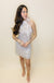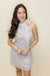 Get ready to turn heads with our Beige Rosette Organza dress! This H-line mini dress features a band tie mock neck, sleeveless design, and delicate floral detailing with beaded accents. Perfect for any occasion, this dress combines elegance and playfulness for a unique and eye-catching look.