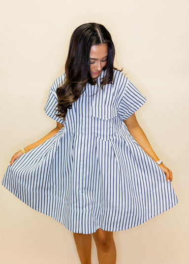 Meet your new go-to dress! This adorable navy stripe A-line dress is the everyday essential you didn't know you needed. With a flattering A-line si...