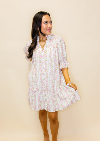 Twirl into spring in this charming cream floral print dress! Delicate blooms dance across a soft, neutral base that pairs effortlessly with your fa...