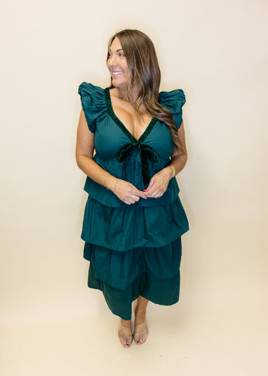 Step into fun elegance with this Hunter Green Tiered Midi Dress featuring a velvet shirring V-neck and a charming bow band. Four layers of flouncy ...